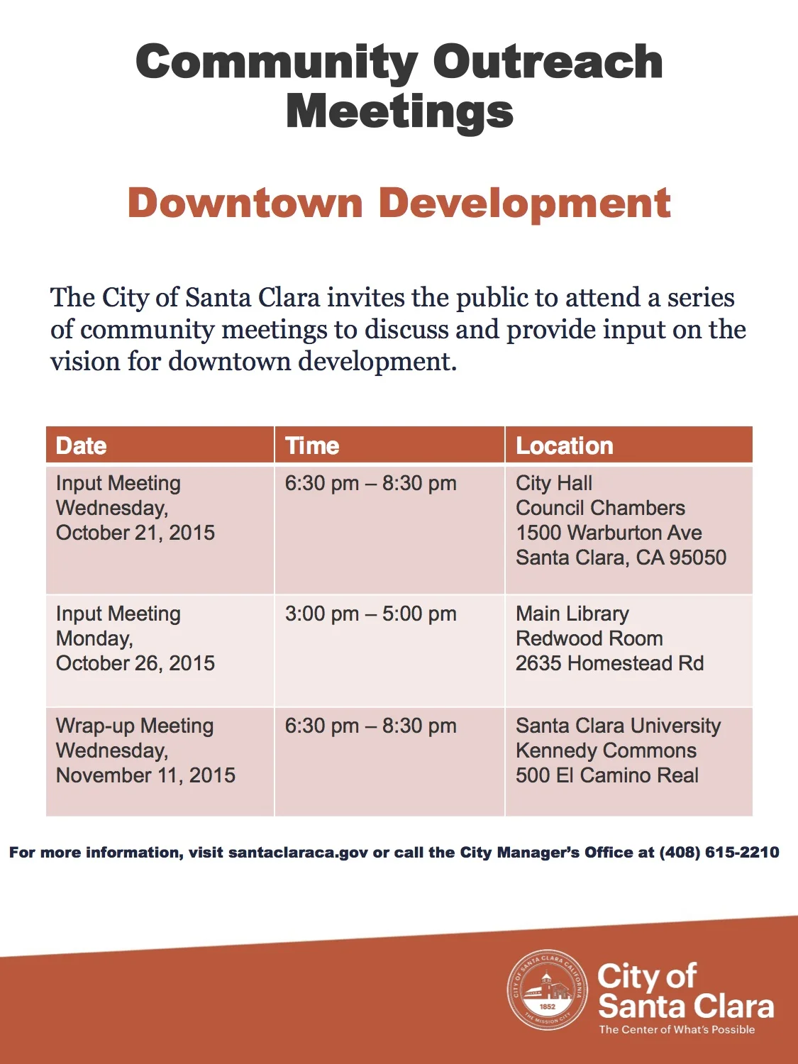 The first meeting in a series of three meetings will be held to solicit community input on an overall vision for the development of downtown Santa Clara. The first two meetings are designed to solicit community input and the third meeting will provide a summary of the input received.