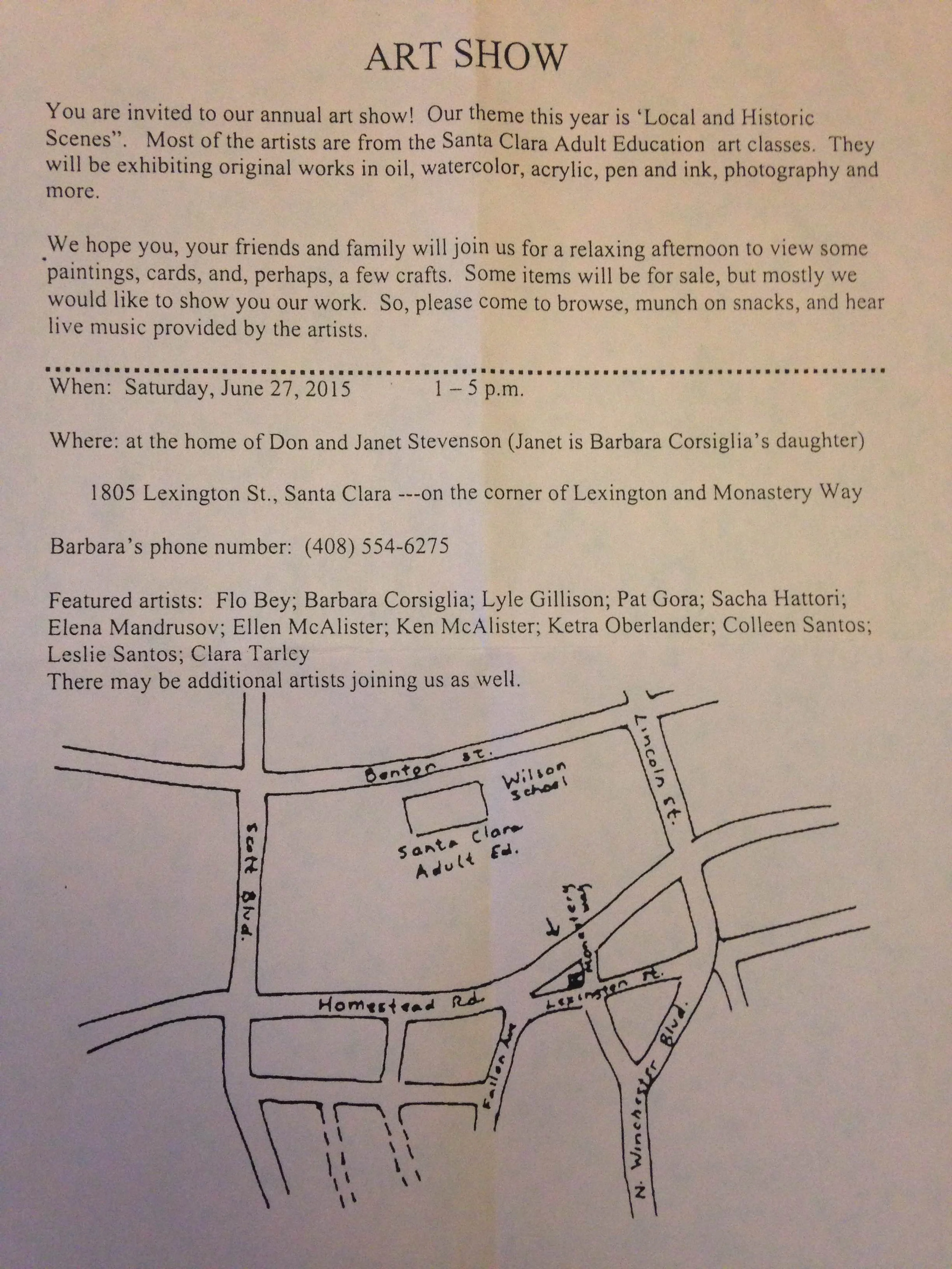 Neighborhood Art Show Saturday, June 27, 2015 1:00 PM 5:00 PM 13:00 17:00 1805 Lexington St Santa Clara, CA, 95050 United States (map) Google Calendar ICS